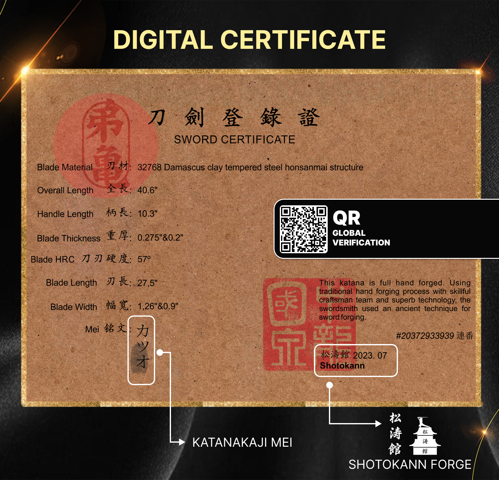 11. Do the swords come with a forging certificate? Yes, all of our swords come with a forging certificate. The certificates are sent digitally and are valid as an official certificate of the Shotokann forge worldwide.
