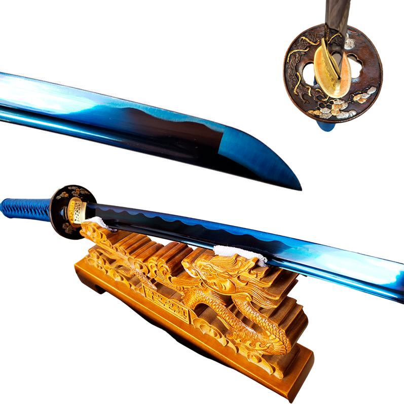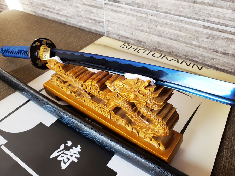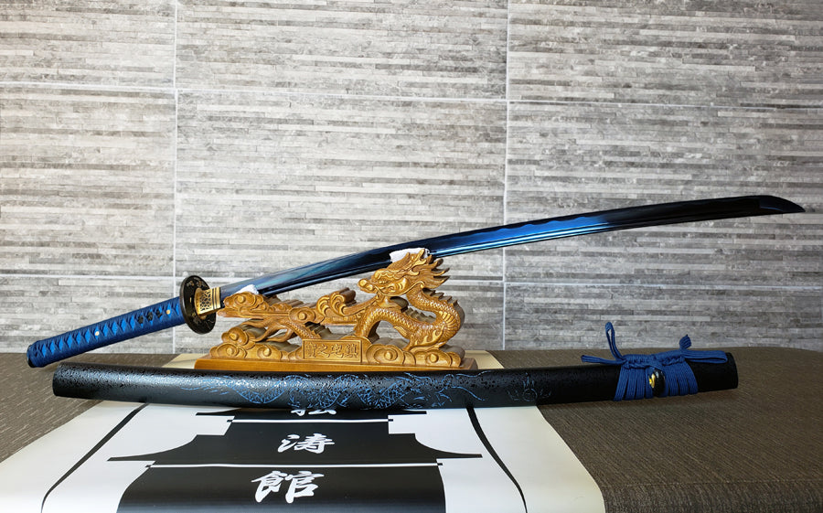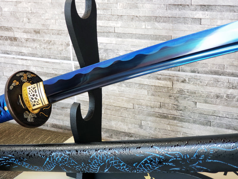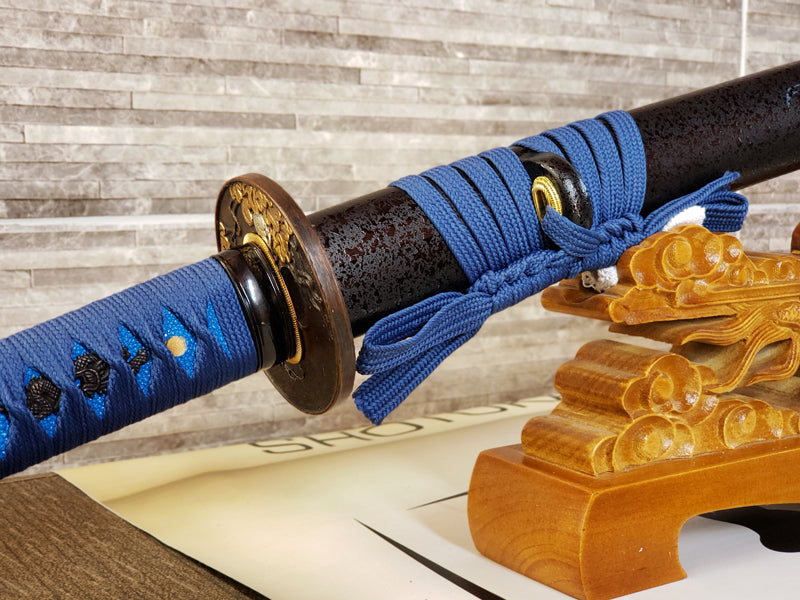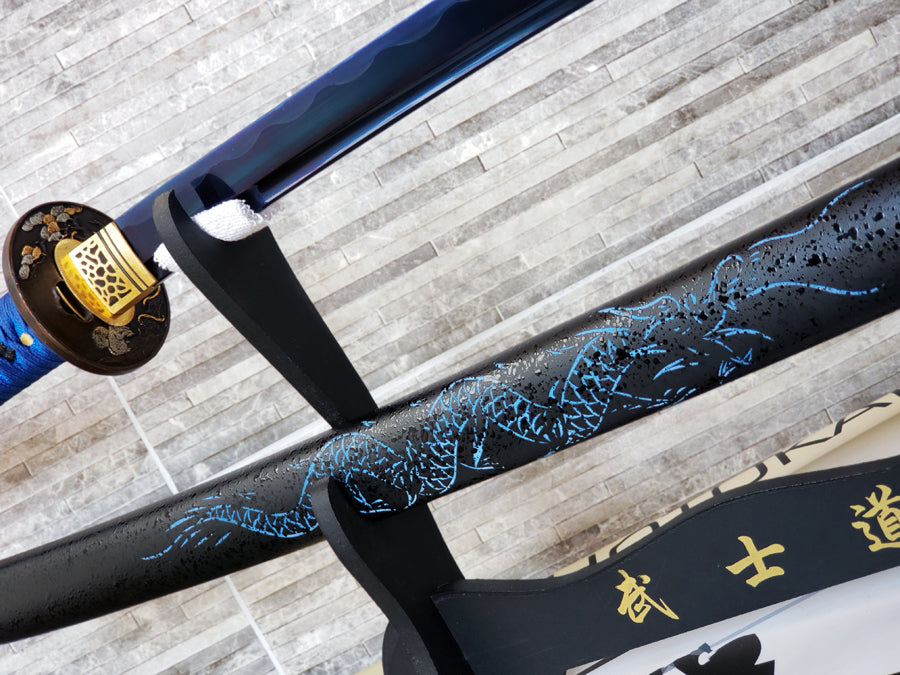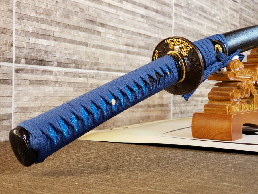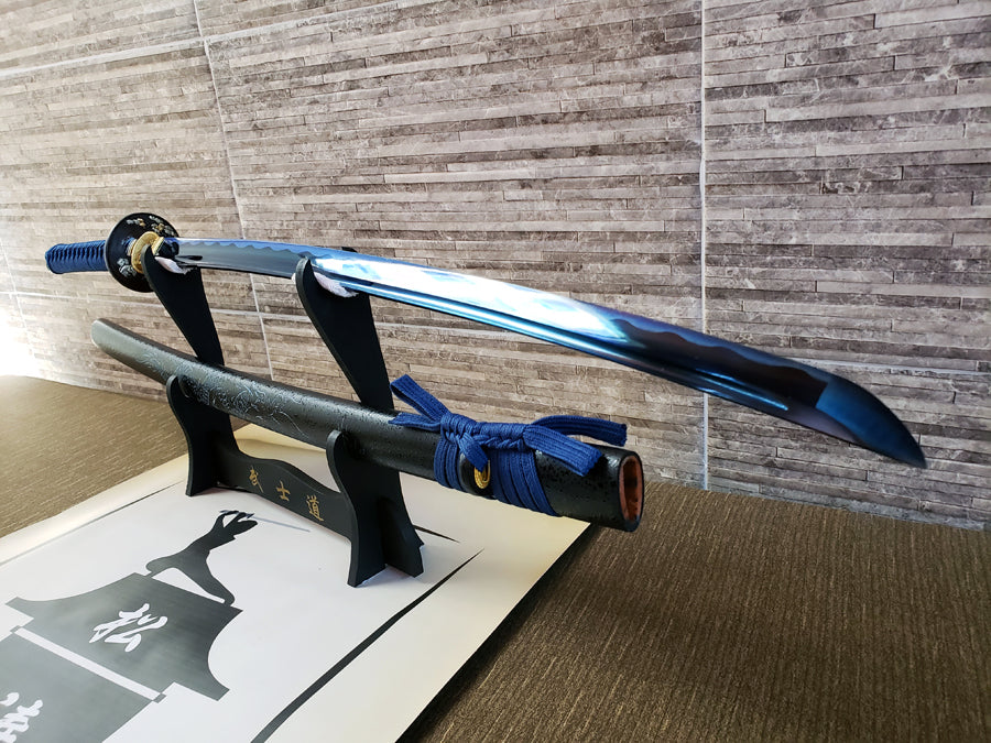 Hand-forged and polished through 12 different procedures, the Katana Tenchu offers the perfect balance between cutting, resistance, weight, and practicality. Its blade, made of 1095 carbon steel with a blue galvanized finish, combines strength with a unique aesthetic, undergoing rigorous cutting tests (Tameshigiri) to ensure its efficiency in both heavy and light cuts.