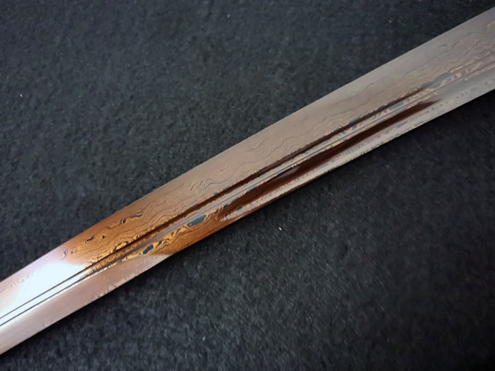- Blade Material: 1060 carbon steel core (Shintetsu) + 1075 carbon steel folded 11 times, generating 2048 layers of Damascus steel around the core (Kawatetsu), red electroplated