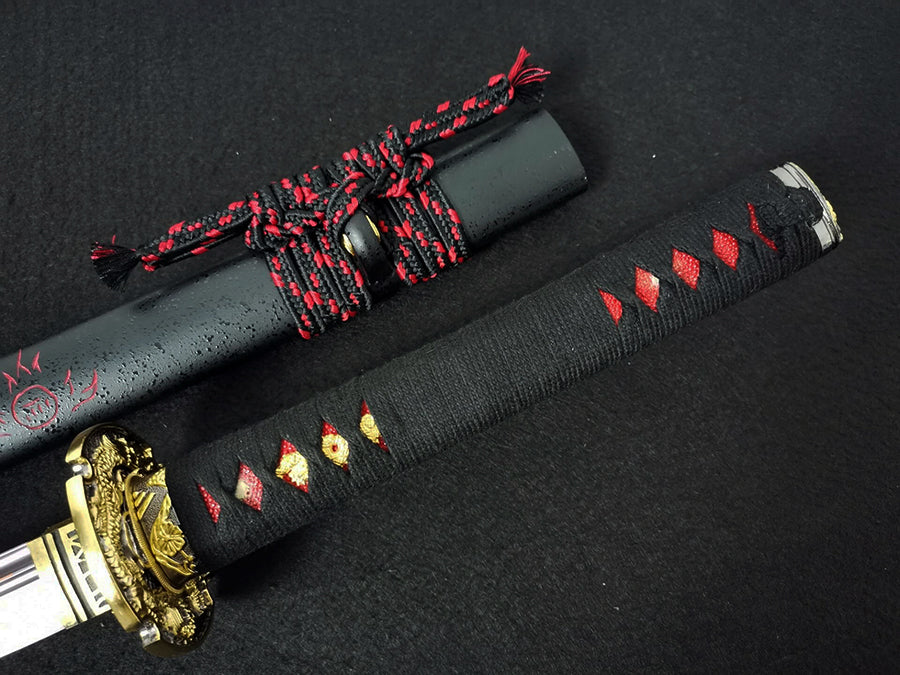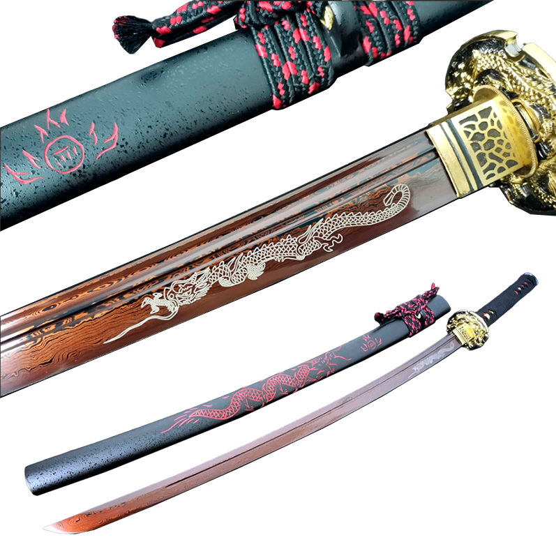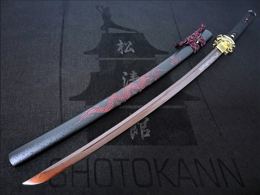 Hand-forged and polished with 12 different procedures, the Kaoru Dragon Katana offers a perfect balance between cutting, resistance, weight, and practicality. Its red blade, obtained through the electroplating process, gives it a unique and impressive aesthetic. Rigorously tested (Tameshigiri), this katana is effective in both heavy and light cuts.