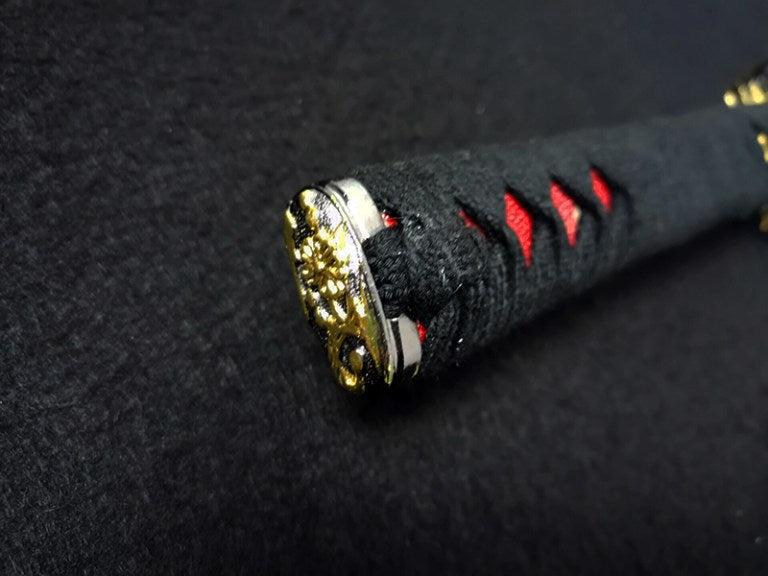 The Tsuba, located above the saya, is ornamented and made through metal fusion. It serves to protect the user's hand from sliding onto the blade during training practice.