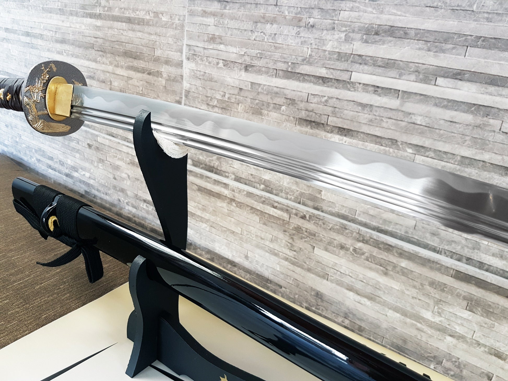 The Habaki is a metal piece that separates the blade from the scabbard. It serves both an aesthetic and functional purpose, ensuring the connection between both. Small scratches are normal due to use.