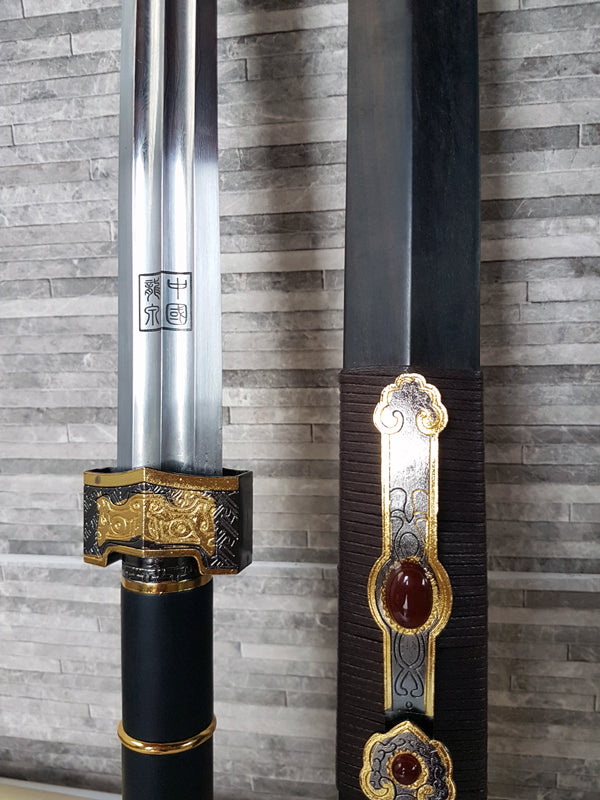The blade of the Jian Huang Long is hand-forged and polished with 12 different procedures, using high-purity carbon steel. This ancient process ensures the maximum efficiency and strength of the blade, even without an edge.