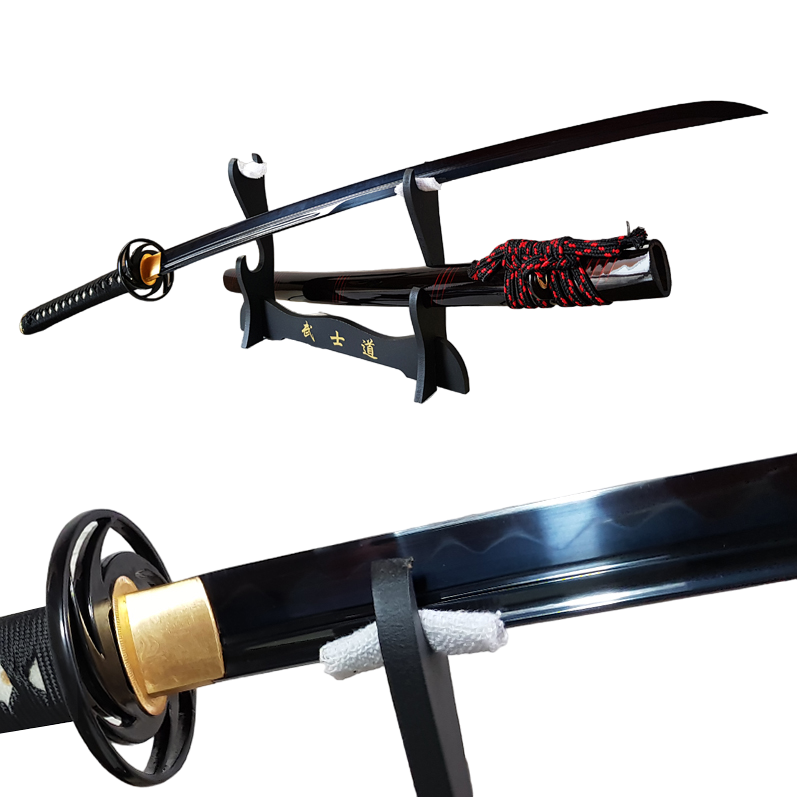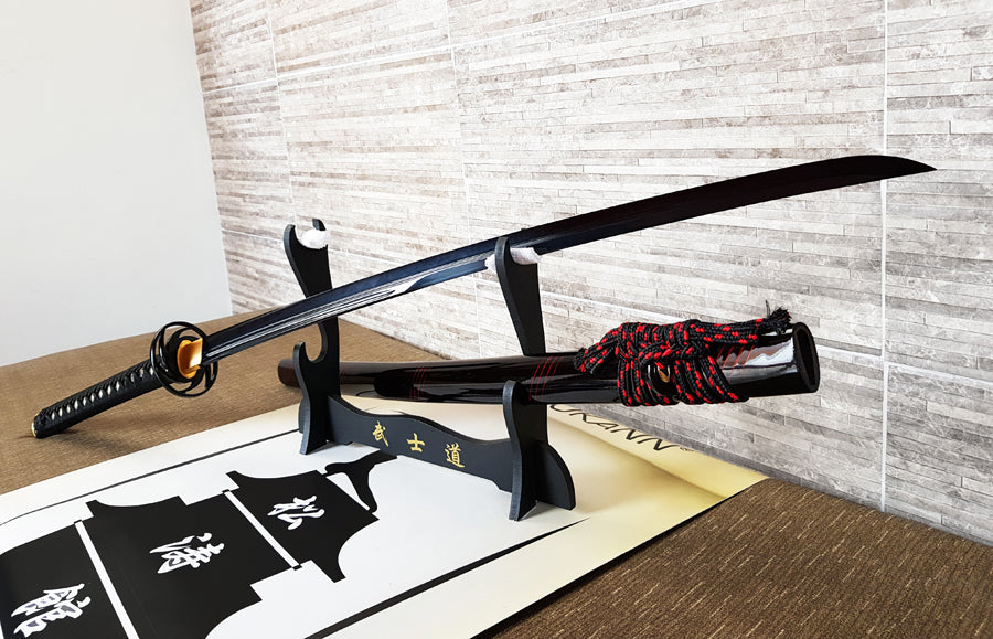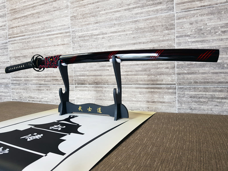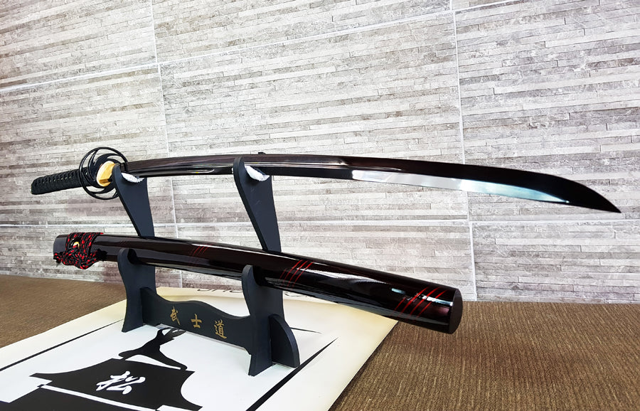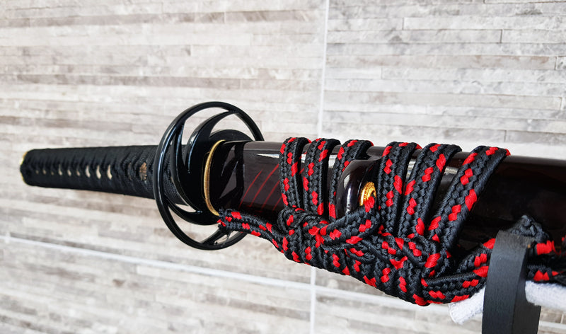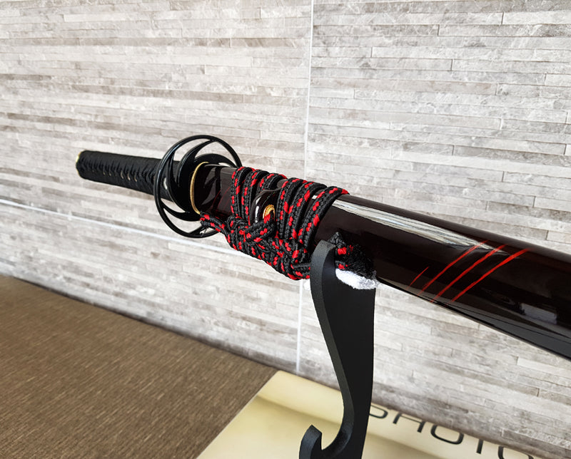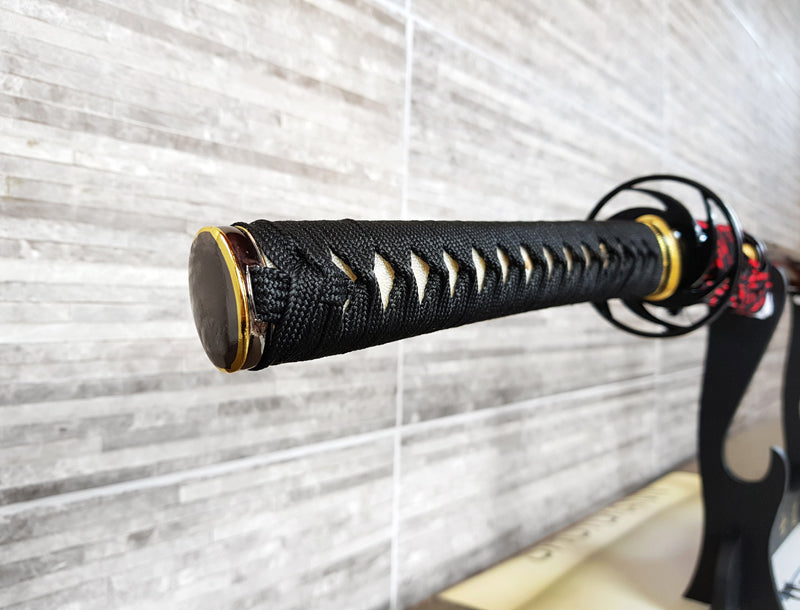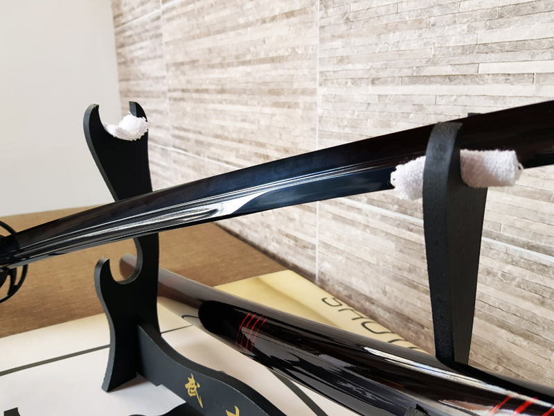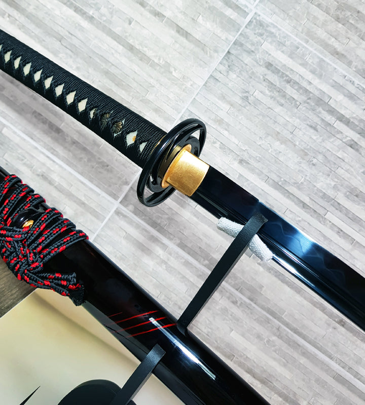 Hand-forged and polished with 12 different procedures, the Katana Akatsuki offers a perfect balance between cutting, strength, weight, and practicality. Its blade, made of galvanized carbon steel 1095 folded 10 times, creates 1024 hardness layers, ensuring strength and durability. The blade has a black aesthetic, obtained through the electroplating process, and is equipped with two distinct grooves, one long and one short on both sides, providing audible feedback during handling. Rigorously tested (Tameshigiri), this katana is effective in both heavy and light cuts. The blade is full-tang, extending to the end of the handle to ensure sufficient impact resistance.
