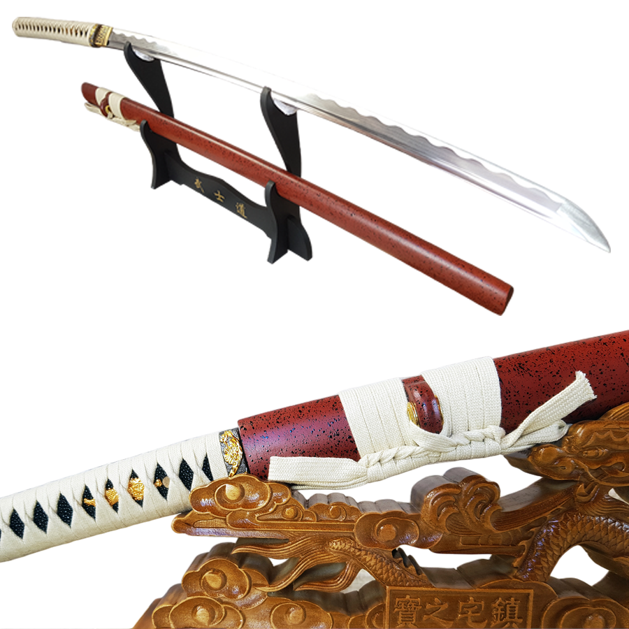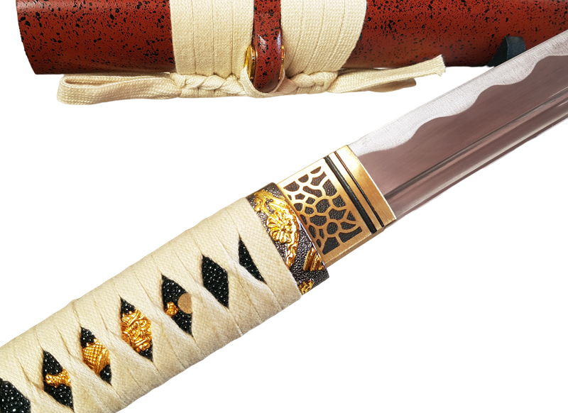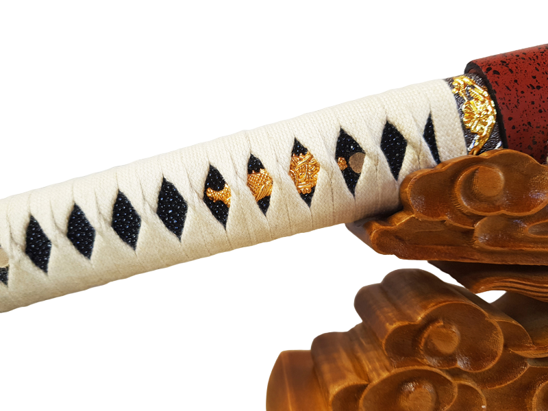 - Tsuka (handle): Silk, hardwood, and ornamental ray skin.