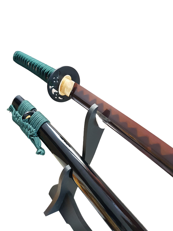 - Blade: The blade of the Katana Orora is forged and polished manually through a traditional method, using ultra-pure carbon steel. The galvanization process gives the blade its impressive black and red color, combining modern techniques with tradition.