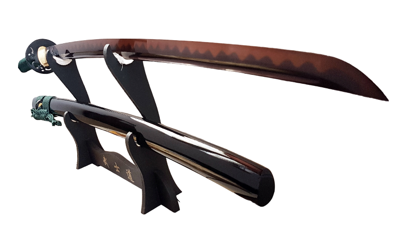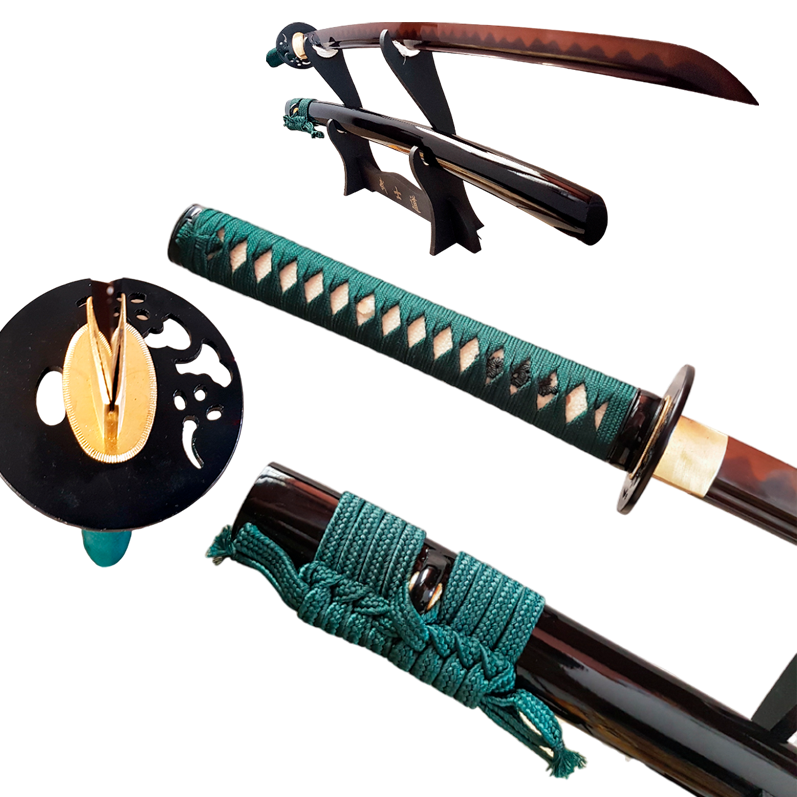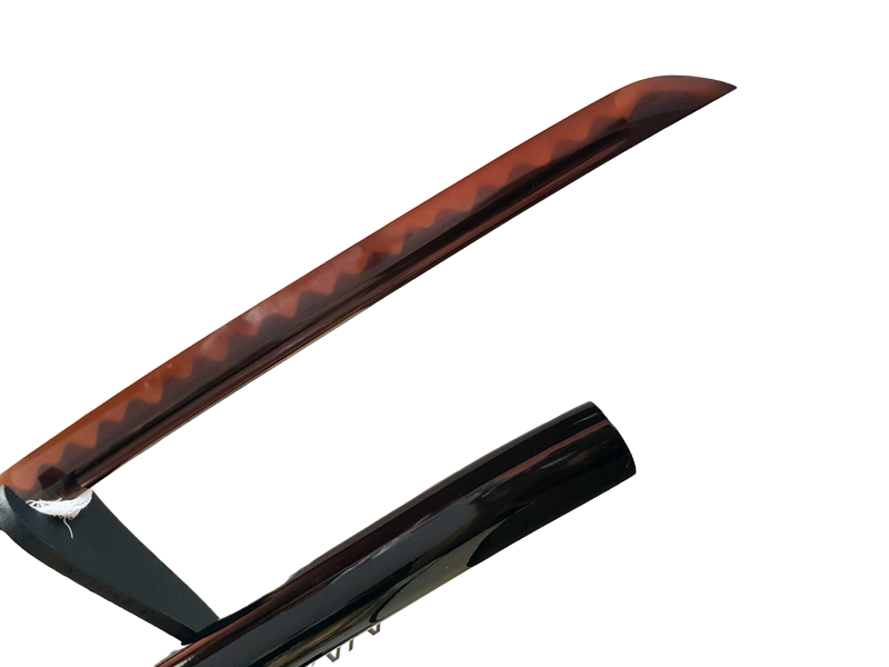 Hand-forged and polished with 12 different processes, the blade of the Katana Orora demonstrates a perfect combination of strength and elegance. Sharp and resilient, it has passed all cutting tests (Tameshigiri) with flying colors, showcasing its effectiveness in both heavy and light cuts. The blade is made of galvanized black and red carbon steel 1095, offering a unique aesthetic and robust performance. Solid and extended to the hilt, the blade ensures impact resistance and superior stability. Each katana is meticulously crafted and hand-sharpened, following the molds of traditional katanas from feudal Japan, with pieces fitted precisely to avoid any wobbling during handling.