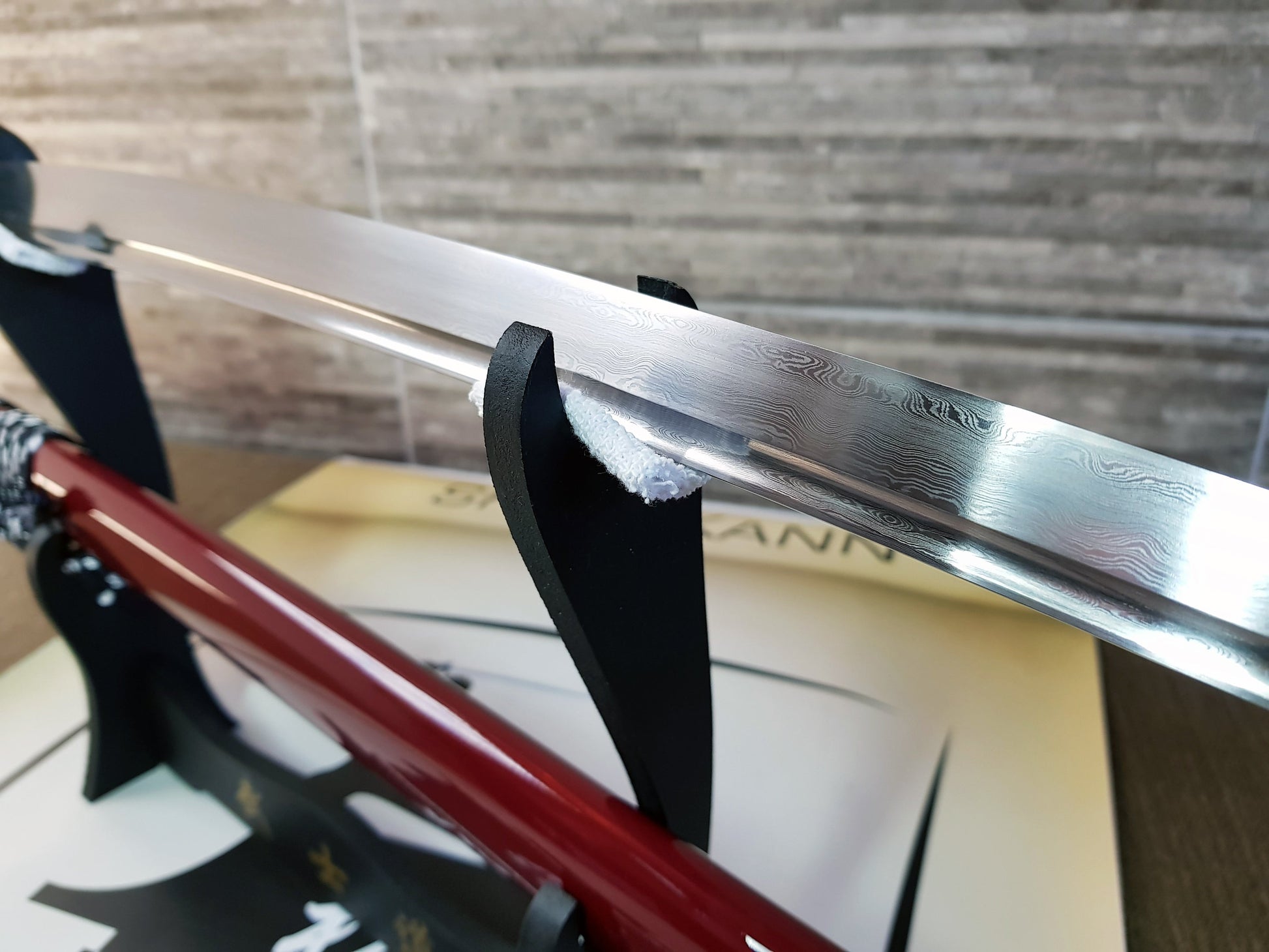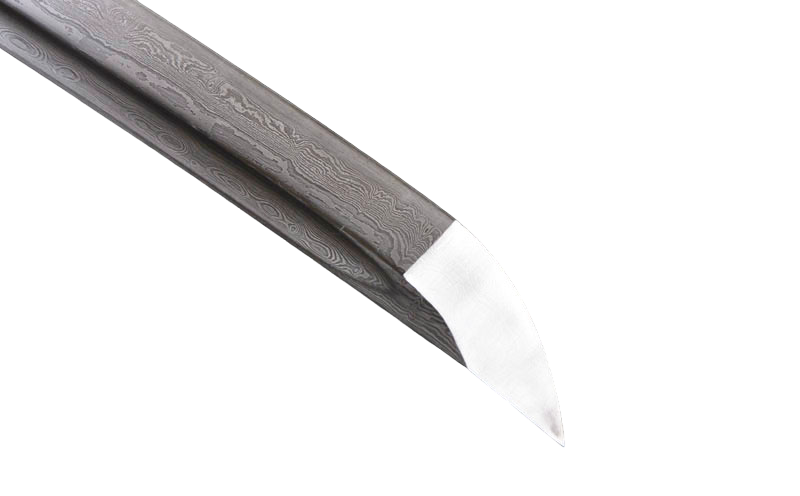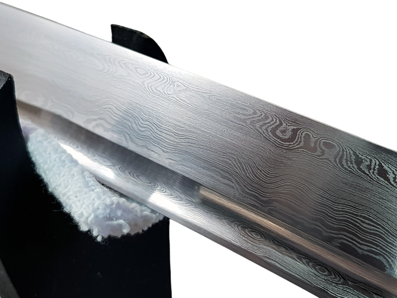 - Blade Material: Carbon steel 1060 in the core (Shintetsu) + carbon steel 1075 folded 11 times, generating 2048 layers of Damascus steel around the core (Kawatetsu).