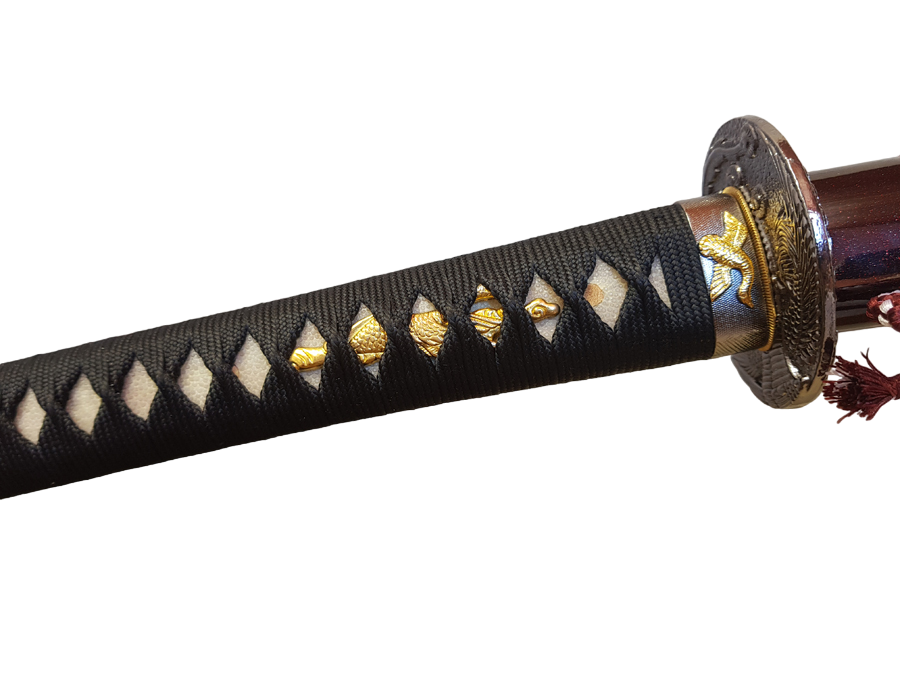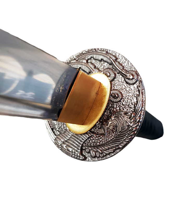 Located above the grip, the Tsuba of this sword is ornamented and crafted through metal fusion. It protects the user's hand from sliding onto the blade during practice.